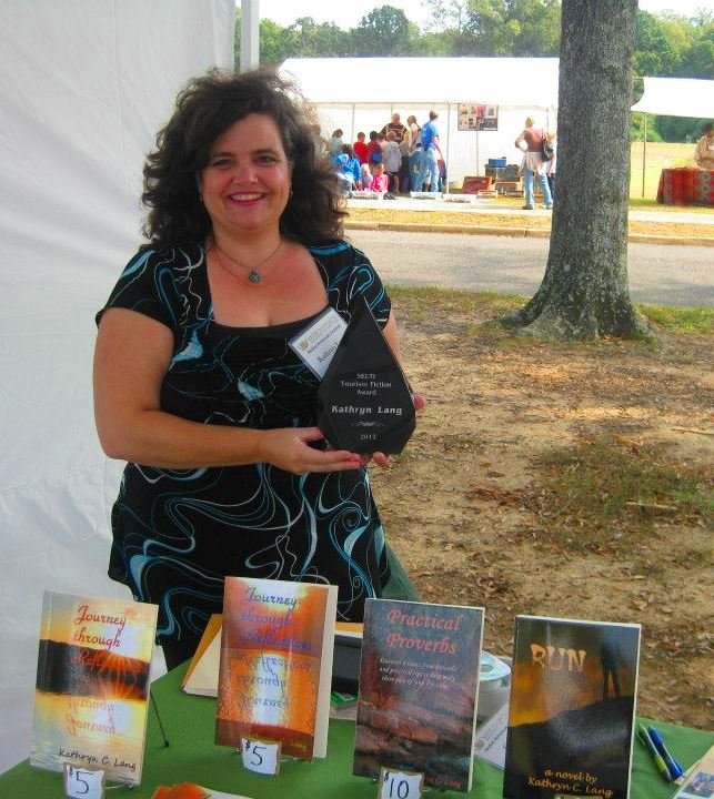 Kathryn Lang holds the SELTI Tourism FictionAward in front of her books at the Moundville Native American Festival.