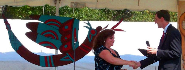 That contest, the Inaugural SELTI Writing Contest, was the first in the nation that challenged fiction writers to promote a real tourism attraction: Moundville. When writers around the state heard about the contest, they took the initiative to apply their unique talents to promote this special place through stories set at Moundville. When the entries came in, English and marketing professors from the University of Alabama took the initiative in accepting the challenge to judge the stories and determine a winner.The winner is here with us today, and her short story captured everyone’s attention as soon as they read it. In fact, an important part of her story described the dance performance that we just witnessed on this stage. Her name is Kathryn Lang, and you can still read her short story online at SELTI in the May 2012 feature.Before I present Kathryn with the 2012 SELTI Tourism Fiction Award, I would like to take a moment to ask all writers to consider featuring Alabama tourism attractions as settings in their works of fiction. Our state has so many wonderful attractions to inspire writers, from beautiful sunny beaches in the south to scenic mountain getaways in the north, from large cities with unique museums and theaters to small towns with personal history and charm. I hope all writers and publishers in this state will follow Kathryn’s example in helping to not only tell a great tale but to promote our great state at the same time by inviting their readers to come visit a real place in Alabama.The next town featured might be your home town or city. The new e-books you kids are starting to read now can do some amazing things that paper books could never do when I was growing up. Some of you may become famous writers someday soon, so I hope you’ll all consider including real places like Moundville and others that inspire you in your work.Kathryn has a tent on site, so if anyone would like to talk more with her, stop by and see her after this presentation. So Kathryn, as your senator, I’m proud to present